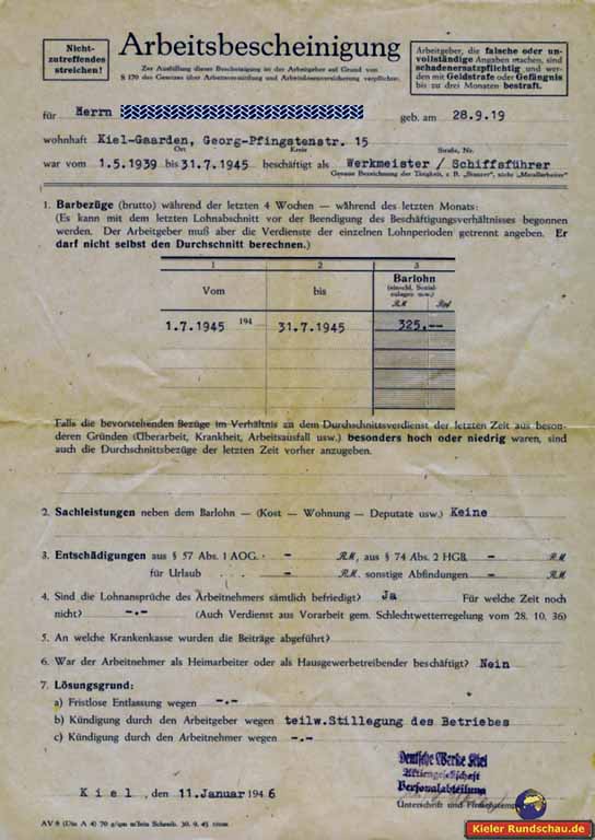 Arbeitsbescheinigung der Deutsche Werke. 1946