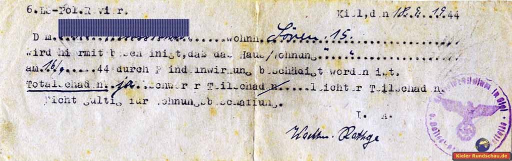 Bescheinigung eines Totalschadens durch Feindeinwirkung von 1944