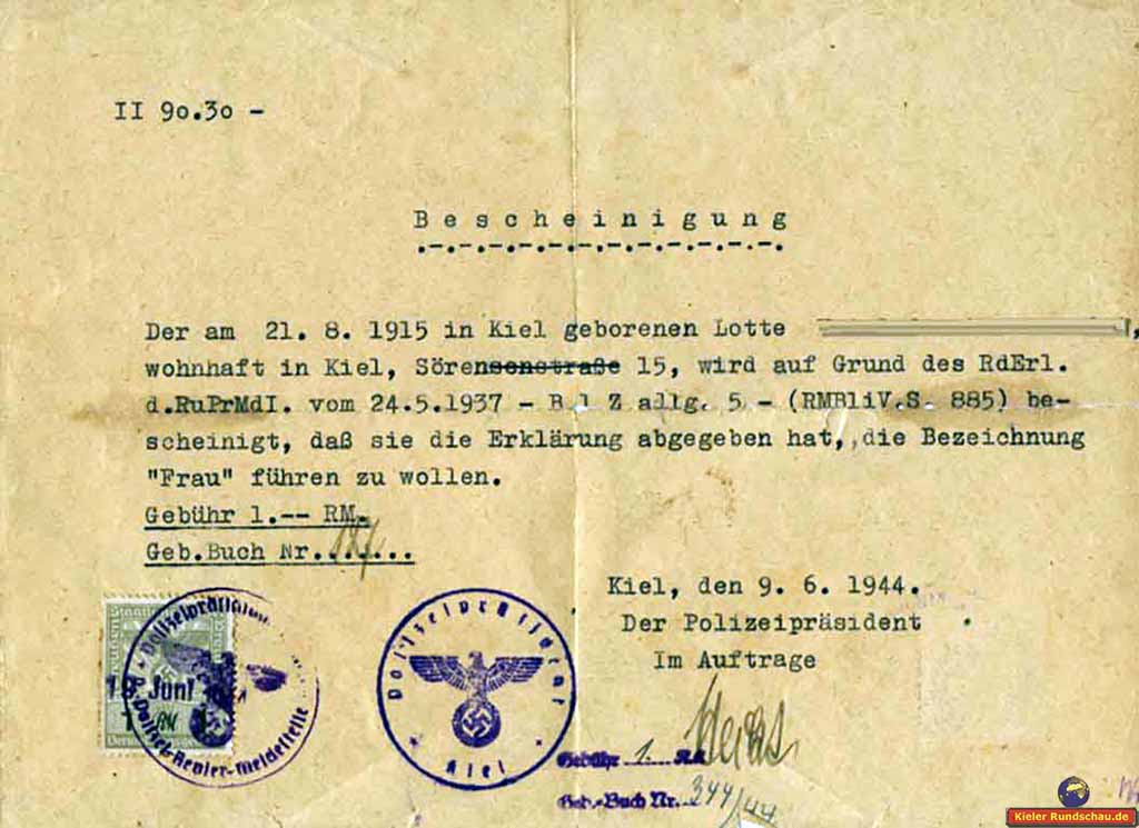 Bescheingung der Erklärung die Bezeichnung „Frau“ führen zu wollen. 1944