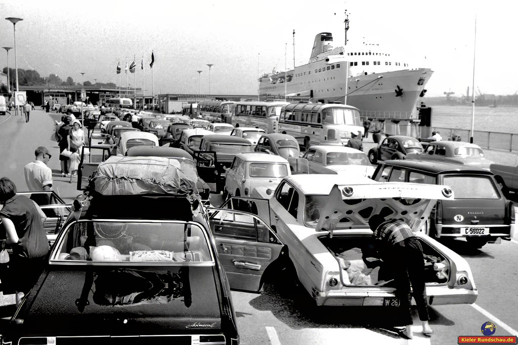 1965 Oslokai, „Kronprinz Harald“. Endlich Ferien. Warten auf die Verladung der Autos nach Oslo.