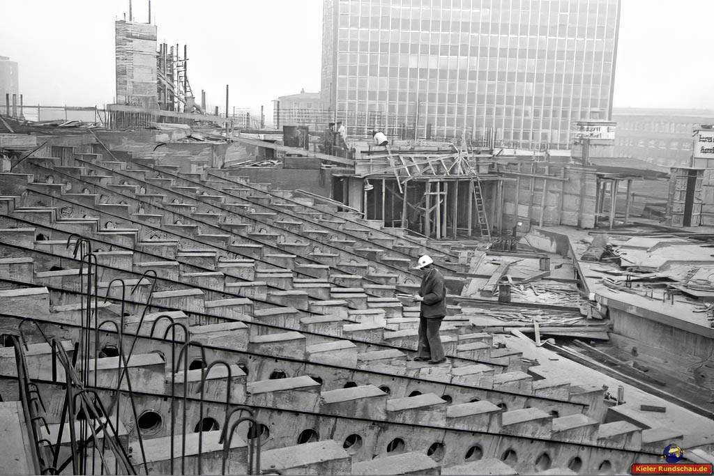 12.9.1965 Auf dem Gelände des Seefischmarkt wird der Kiel Leuchtturm montiert.