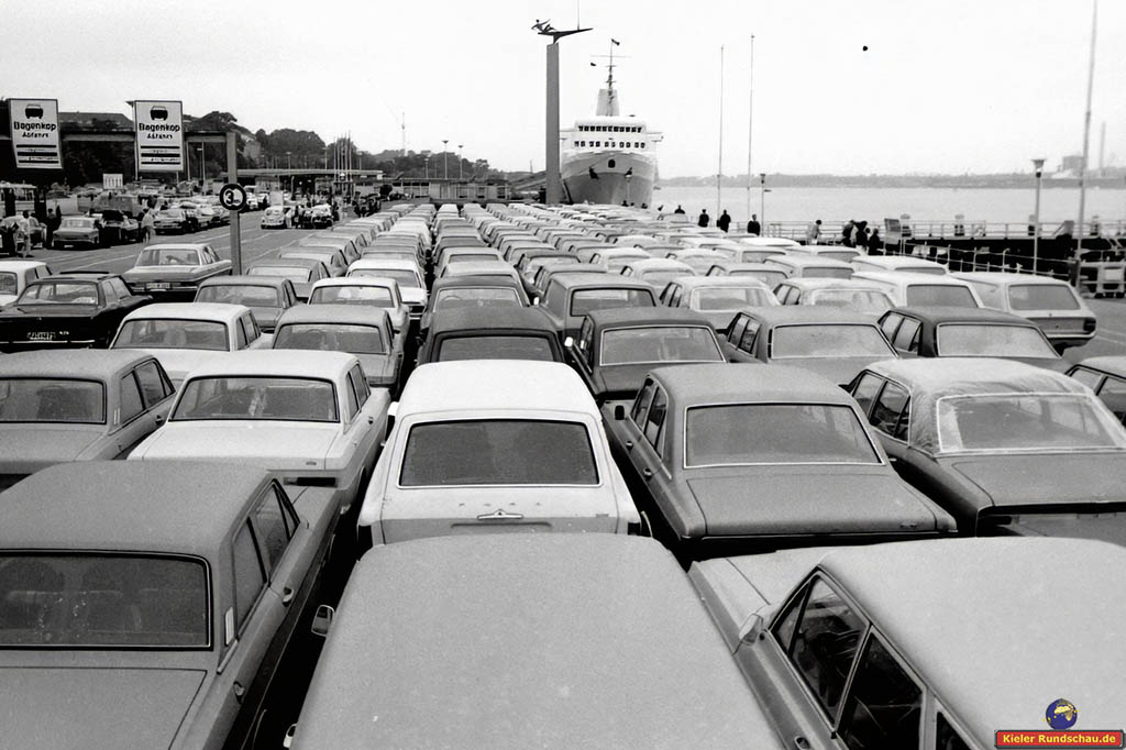 1965 Oslokai, „Kronprinz Harald“. Endlich Ferien. Warten auf die Verladung der Autos nach Oslo.